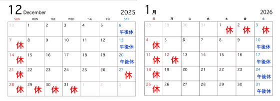 年末年始期間の営業について、年内の営業最終日は12月26日(金)となります。